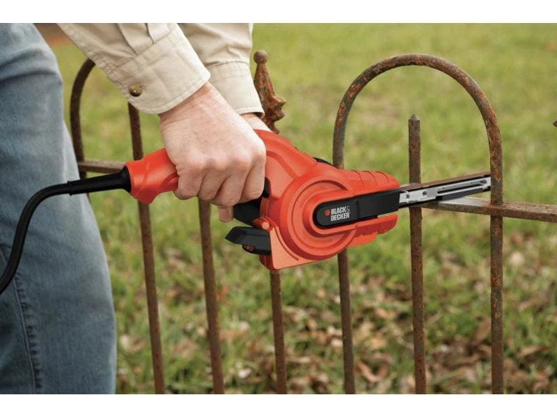 Mit der Powerfeile KA900E von BLACK+DECKER können Sie Holz, Metall, Keramikfliesen, Stein, Gips und auch Kunststoff schleifen und feilen. Auch Formen, Schärfen und Entrosten ist möglich, dank des 13-mm-Schleifbandes, das an einem geraden und schmalen Schleifarm befestigt ist, der auch an schwer zugänglichen Stellen benutzt werden kann. Das Bandzentrierungssystem verhindert, mittels einer Schraube, weiterhin das Abrutschen des Schleifbandes im Schleifprozess. Der Materialabtrag wird aufgrund des 350-W-Motors schnell und genau ausgeführt. Die Drehzahl können Sie variabel einstellen.