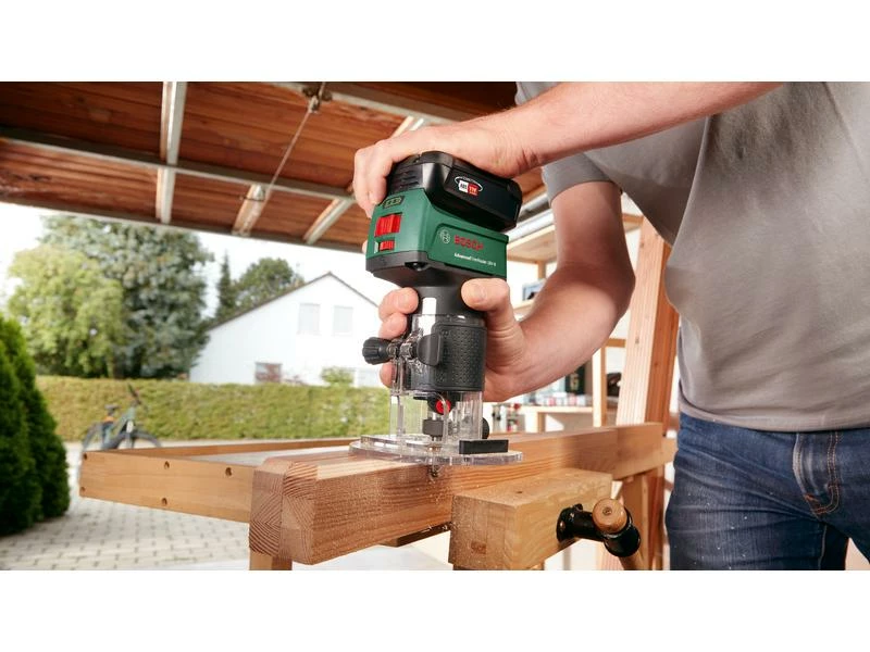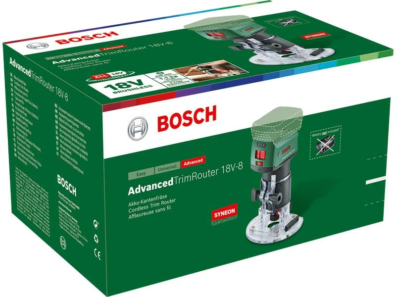 Die kompakte AdvancedTrimRouter 18 V-8 ist dank ihres kompakten Designs und einem Gewicht von nur 1.1 kg leicht und bequem in der Anwendung. Boschs bürstenlose Motortechnologie liefert höchste Leistung für das Fräsen von Nuten oder Schnitzen von Buchstaben und Motiven in Holz, und sorgt gleichzeitig für eine deutlich längere Werkzeuglebensdauer. Für mehr Flexibilität wird diese Fräse mit 6-mm- und 8-mm-Spannzangen für unterschiedliche Bitgrössen geliefert. Energieeffizienz und lange Laufzeit sind unverzichtbar bei Akku-Geräten. Bei dieser Fräse regelt die intelligente Syneon Technology den Energieverbrauch für unterbrechungsfreies, angenehmes Arbeiten. Das Gerät ist Teil der POWER FOR ALL ALLIANCE. Ein einziger Akku kann eine Vielzahl an Geräten verschiedenster Marken betreiben.