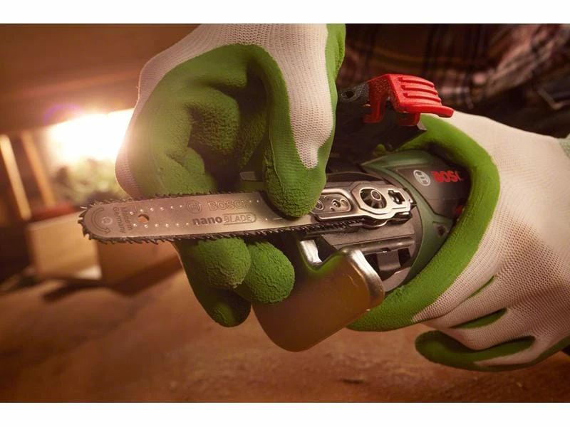 Mit der handlichen EasyCut12 Säge von Bosch fällt Ihnen zukünftig das schnelle Ablängen von Holz, Erzielen von präzisen und geraden Schnitten sowie Freinhandsägen leicht. Dabei unterstützt Sie die intelligente NanoBlade-Technologie, welche für ein müheloses und vibrationsarmes Sägen sorgt. Das Mini-Sägeblatt mit rundlaufender Kette ermöglicht saubere Schnittergebnisse und lässt sich zudem unkompliziert ohne Spannen sowie Ölen wechseln.