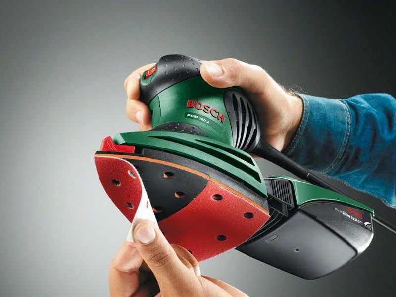 Der Multischleifer eignet sich mit seiner Deltaform für Polier- und Schleifarbeiten an schwer zugänglichen Stellen. Durch den Klettverschluss erfolgt der Schleifblattwechsel schnell und unkompliziert. Das integrierte Staubsaugerelement beseitigt den anfallenden Holzstaub sofort und sorgt so für eine freie Arbeitsfläche. Mit dem Multischleifer ist auch der Einsatz von optionalen Aufsätzen, wie einer Schleifzunge oder eines Lamellenvorsatzes möglich.
