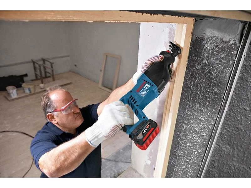 Die 18-Volt-Akku-Säbelsäge GSA 18V-LI von Bosch Professional eignet sich für nahezu alle Sägearbeiten auf der Baustelle oder in der Werkstatt. Sie bietet nicht nur die höchste Schnittleistung in ihrer Klasse, sondern ist auch effizient genug, um über 100 Fichtebalken (100 x 100 mm) mit nur einer Akkuladung abzulängen. Die 2-stufige Geschwindigkeitseinstellung unterstützt Sie beim der Bearbeitung unterschiedlicher Materialien. Das Sägeblatt sitzt in einer SDS-Aufnahme und kann daher ohne grossen Aufwand in wenigen Sekunden ausgetauscht werden. Mühevolles Hantieren mit Schraubenschlüsseln oder ähnlichen Werkzeugen gehört so der Vergangenheit an. Der ergonomisch geformte Handgriff mit Komfortzone im Softgripbereich garantiert einen sicheren Halt und ermüdungsarmes Arbeiten.