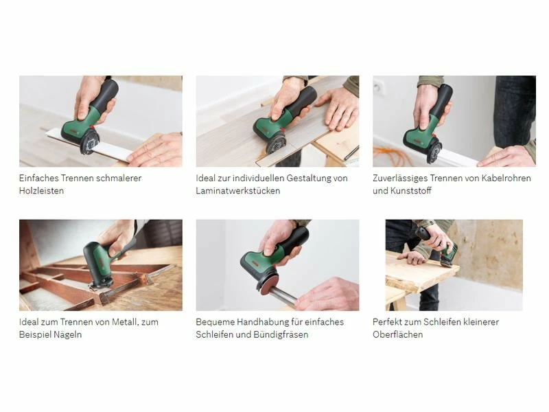 Das Bosch EasyCut&Grind Allround-Trennwerkzeug eignet sich ideal zum bequemen und einhändigen Arbeiten in engen Bereichen. Der Freihand-Schneide-Adapter verbessert die Schnittleistung und ermöglicht gleichzeitig schnelle und geführte Schnitte. Der starke, durch einen Lithium-Ionen-Akku angetriebene Motor und das umfangreiche Zubehörset gewährleisten multifunktionale Vielseitigkeit.