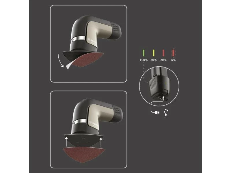 Der YOUseries Sander ist ein schlanker, stilvoller und leistungsstarker Deltaschleifer für ein modernes Zuhause. Das Akkugerät überzeugt mit seiner kompakten, ergonomischen Form und seiner Deltaschleifplatte. Diese erlaubt die mühelose Bearbeitung von Ecken, Kanten und schwer zugänglichen Bereichen. Betrieben wird das Gerät mit einem austauschbaren YOUseries Lithium-Ionen-Akku, der sich komfortabel über USB-C aufladen lässt. Ein Klettverschlusssystem ermöglicht einen schnellen und einfachen Schleifpapierwechsel.