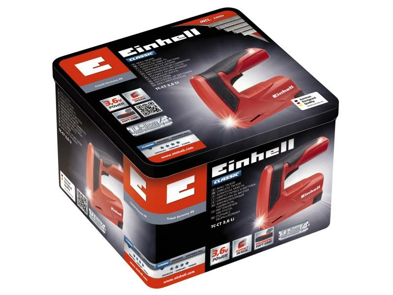 Mit dem Einhell Akku-Tacker TC-CT 3.6 Li erledigen Sie Befestigungsarbeiten aller Art im Handumdrehen. Die überaus schnelle Schussfolge von 30 Schüssen in der Minute, gewährleistet einen zügigen Arbeitsfortschritt. Der verbaute 3,6-V-Lithium-Ionen-Akku sorgt für grenzenlose Freiheit beim Einsatz des Tackers. Die Sicherheitsnase, welche ein unbeabsichtigtes Auslösen der Klammerung verhindert, schützt Mensch und Material. Der ergonomisch geformte Handgriff mit Softgrip-Auflagen sorgt für bequemes und ermüdungsfreies Arbeiten.